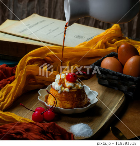 ホイップクリームとチェリーをトッピングしたプリンに、たっぷりのカラメルソースが注がれる瞬間