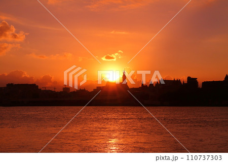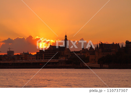 西ヨーロッパのベルギー アントワープを流れるエスコー川の対岸から朝焼けの市街地のシルエット