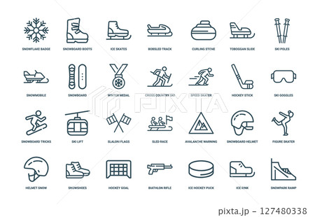 collection winter sport icons skiing snowboarding ice skating equipment, medal cross snowmobile