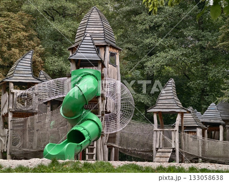 outdoor area with castle towers, exterior play zone with turrets resembling wooden castle structure