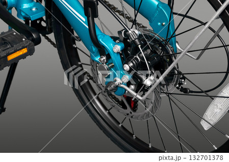 Close-up of mountain bike brake disc part. Technical expertise of bike shop service in the open air. Mountain bike parts