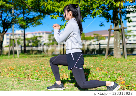緑地で下半身を鍛える若い女性 ランジ スクワット 自分磨き ダイエット