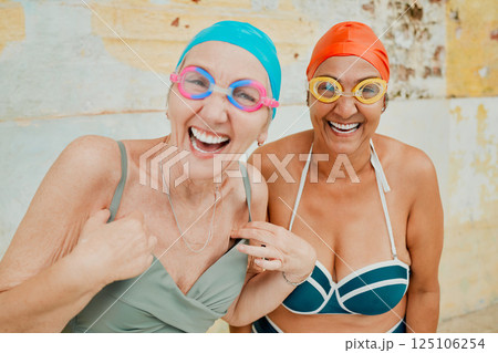 Swimming, vacation and portrait of senior friends with goggles and swim caps ready for pool. Happiness, smile and elderly women at water aerobics class while on retirement holiday in Bali Indonesia.