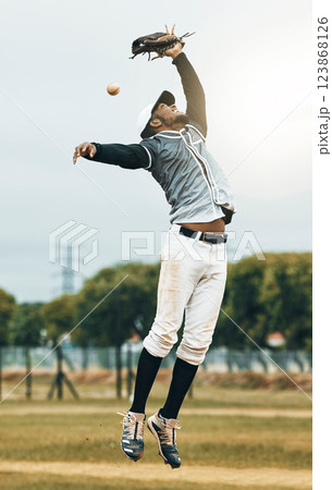 Baseball, sport and person fielder jump on an outdoor sports field during sport game or match. Fitness, training motivation and cardio workout of an athlete man with focus ready to catch a fast ball