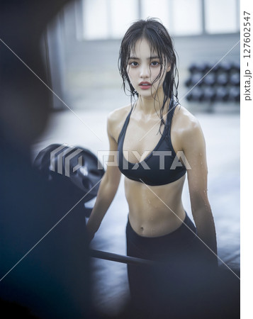 フィットネスジムでトレーニング前の若い日本人女性のポートレート