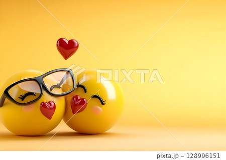 A cheerful illustration of colorful, smiling emoji with hearts above them, symbolizing happiness and friendship against a bright orange background.