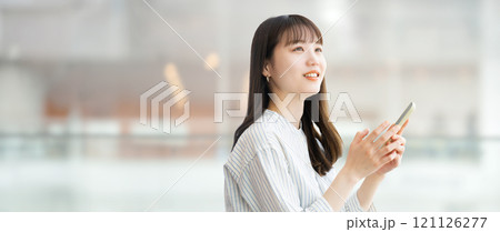 スマホを持つ笑顔の若い女性・ビジネスウーマン