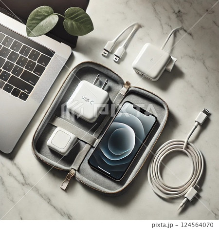 USB-C充電アクセサリを収納したポーチとスマートフォン
