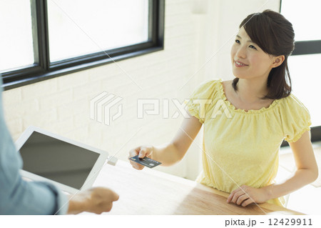 女性 店員 クレジットカード カードリーダー 支払い スマホ スマートフォン スマレジ