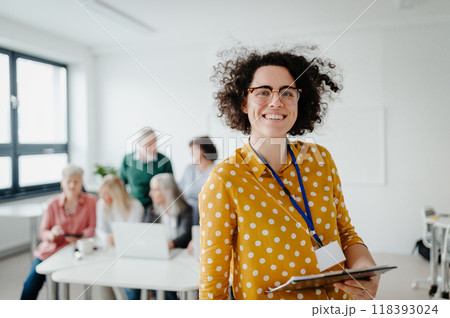 Portrait of teacher with seniors attending computer and technology education class. Digital literacy among elderly people.