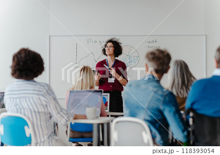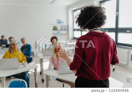 Rear view of teacher in front of seniors attending computer and technology education class. Digital literacy among elderly people.