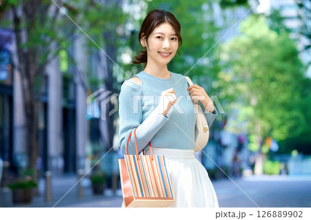 ショッピングしながらスマホを操作するオシャレな若い女性