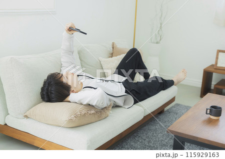 ジャケットを脱いでソファでスマホを見るビジネスウーマン のナイトルーティーン