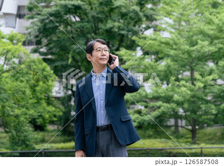 スマホを操作するリュックを担いだスーツ姿のビジネスマン