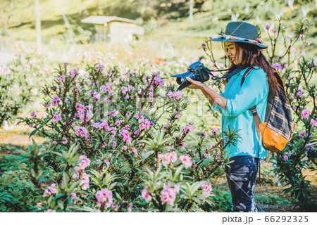 Asian woman travel nature. Travel relax. Standing photographing beautiful pink apricot flowers