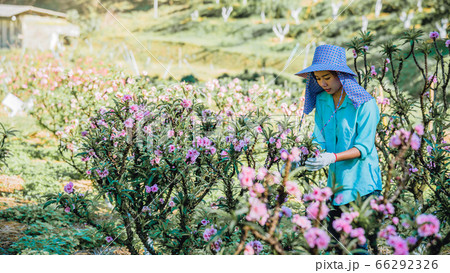 Female farmer workers are working in the apricot tree garden, Beautiful pink apricot flowers