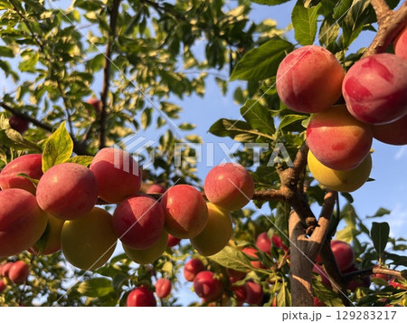 Beautiful ripe red plum fruits on a tree branch
