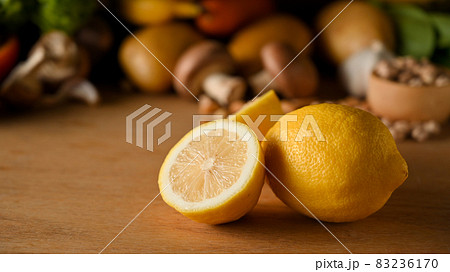 Fresh lemons with a sliced of juicy lemon on cutting board