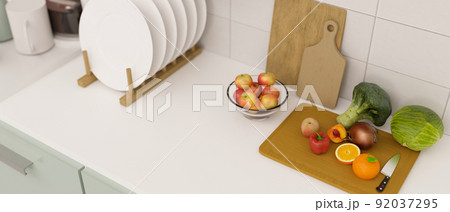 Top view, Modern white kitchen countertop with veggies and fruits slided on a chopping board