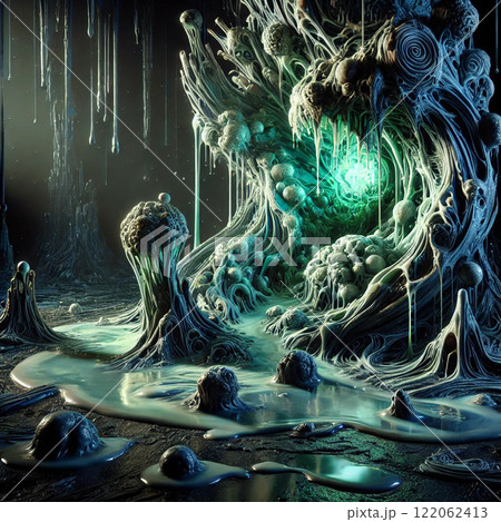 洞窟にスライムのようなドロドロした灰色&緑の液体