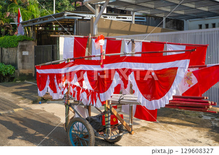インドネシア独立記念日を祝う赤白の旗を売る屋台(移動販売)