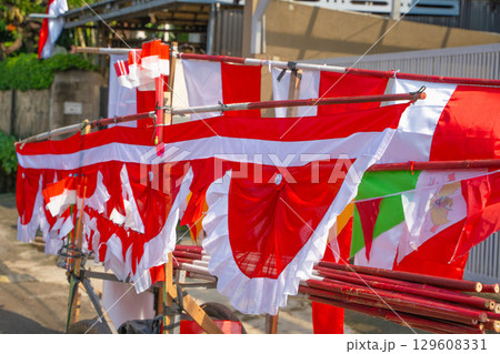 インドネシア独立記念日を祝う赤白の旗を売る屋台(移動販売)
