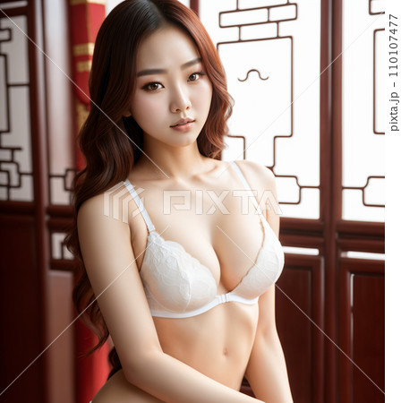 Portrait of young pretty sexy Asian woman wearing white bikini in her room.