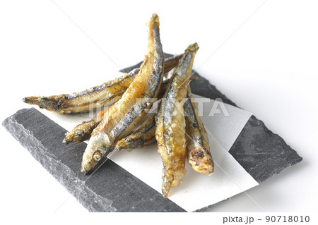 スレートプレート、天紙の上のきびなごの唐揚げを白背景で撮影
