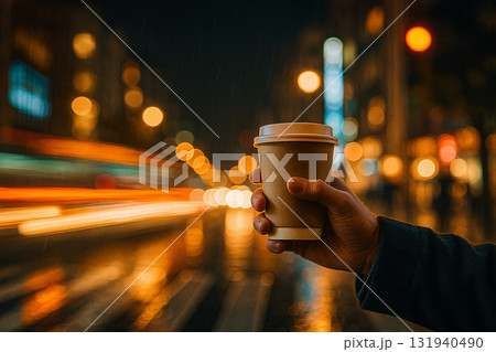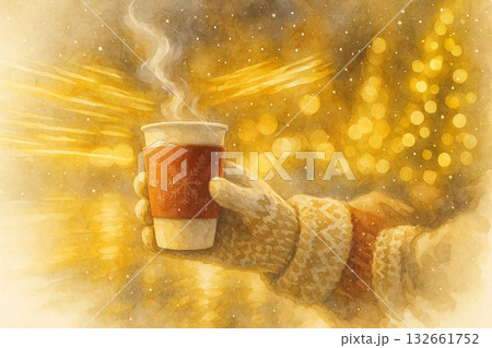 スローシンクロ:冬の街角とホットドリンク|ゴールド&ホワイトの光跡+細雪