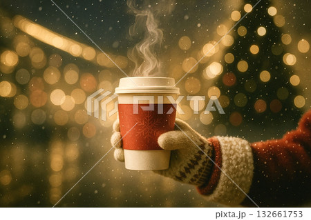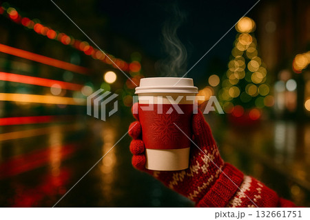 スローシンクロ:冬の街角とホットドリンク|赤・緑・金の光跡