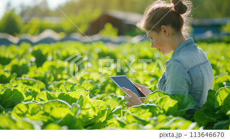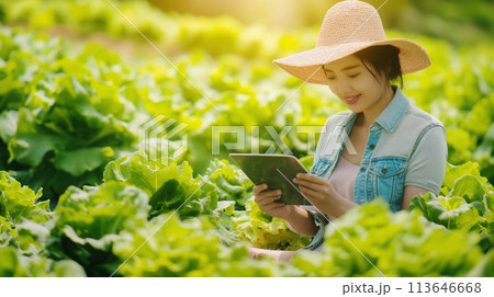 テクノロジーで野菜を管理する女性 agriculture and technology
