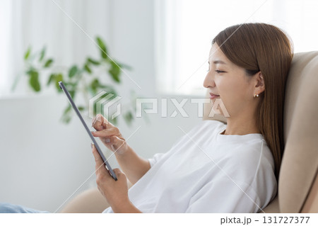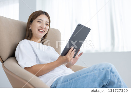 チェアに座ってタブレットを操作する若い女性