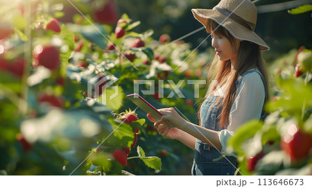 タブレットとテクノロジーでイチゴ農園を管理する女性 Woman with tablet & farm