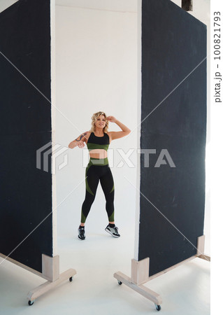 an attractive blonde in a black and green tracksuit poses in the photo studio
