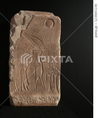 アクエンアテン王一家の太陽円盤の神アテンへの信仰を表す石碑