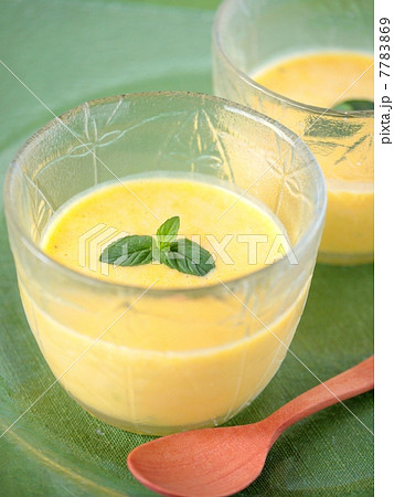 カボチャの冷製ポタージュ ミント添え (ハイアングル)