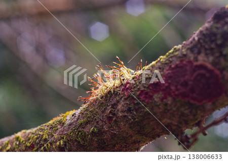 沢沿いの樹皮に育つ苔と胞子体 幻想的な玉ボケ