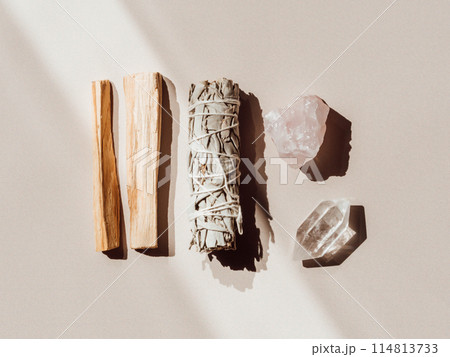 White sage and Palo Santo and amethyst and quartz crystals on a light beige background