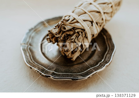 Close up of white sage bundle in ceramic dish on light background,