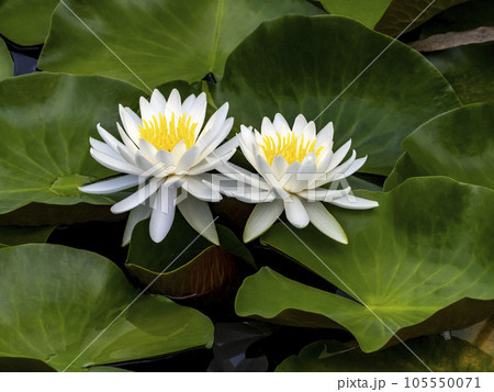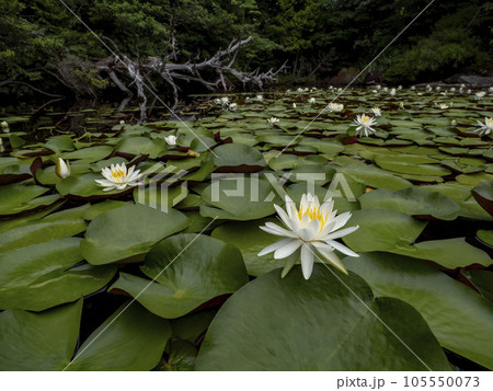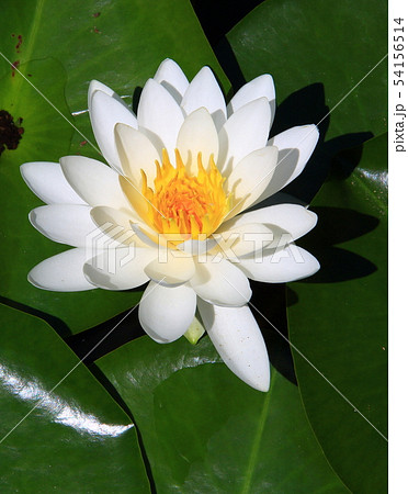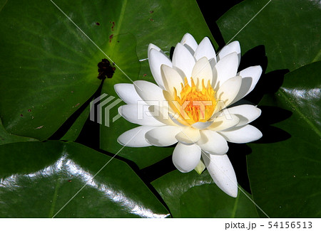 夏の湖に浮かぶ大きな浮水葉に白い花が美しく咲いているセイヨウスイレン(睡蓮)