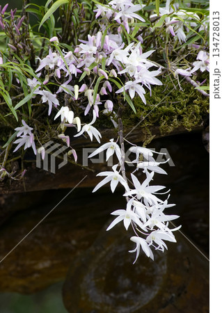 苔から伸びるデンドロビュームの花