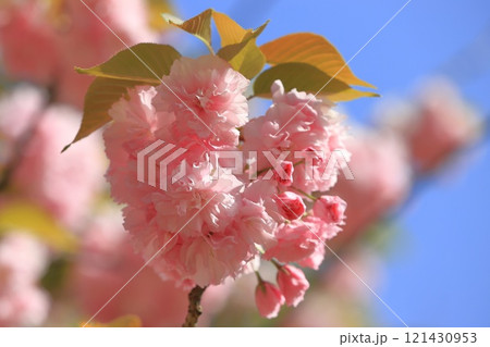 満開の八重桜(関山)のクローズアップ 【青空背景】