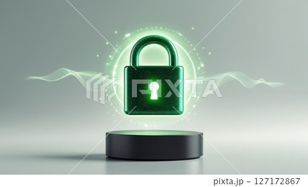 Digital security lock icon on glowing pedestal representing data protection cybersecurity and encryption concept in modern technology