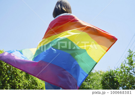 レインボーフラッグを持つ性的マイノリティの女性の後ろ姿
