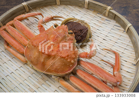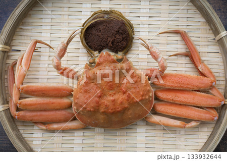 ザルに盛られたメスのズワイガニと外子 冬の味覚