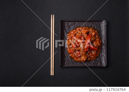 Thai Asian dish with meat, hot pepper, tomato sauce and sesame