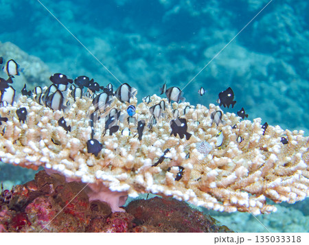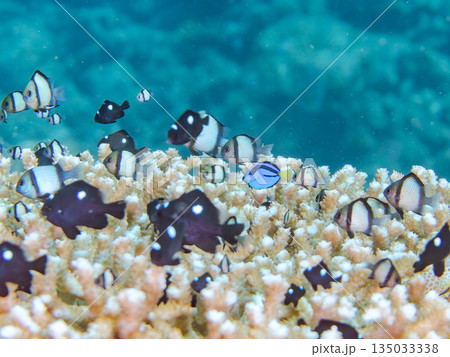 白化したサンゴとセダカギンポ、フタスジリュウキュウスズメダイの幼魚他の群れ。ヒリゾ浜中木南伊豆町伊豆