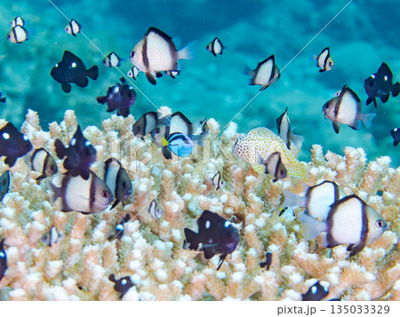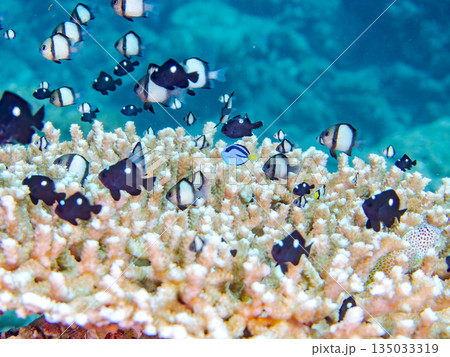 サンゴに住むナンヨウハギ、フタスジリュウキュウスズメダイ他幼魚の群れ。ヒリゾ浜南伊豆町中木静岡県伊豆