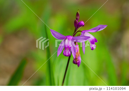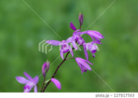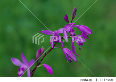 春の野原に咲くピンク色の紫蘭(シラン)の花