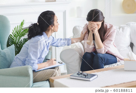 A young woman, wearing a pink shirt and jeans, sits on a beige couch, looking down with her hands clasped together in her lap. She appears to be in a counseling session